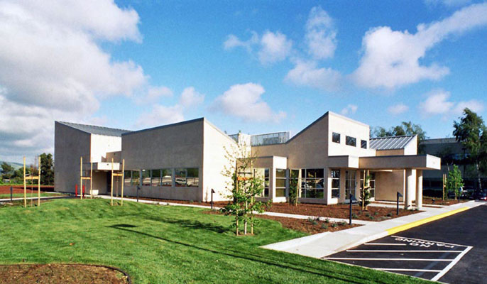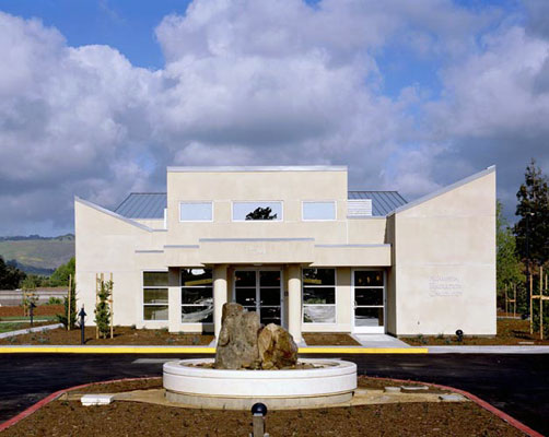This freestanding healthcare building welcomes patients from outside while being supportive of their needs inside. It is the focal point at the terminus of the medical campus entrance drive, behind a fountain with natural boulders designed by our firm. Healing herbs were selected for their colors and fragrances so the psychological healing environment would begin even before entering.