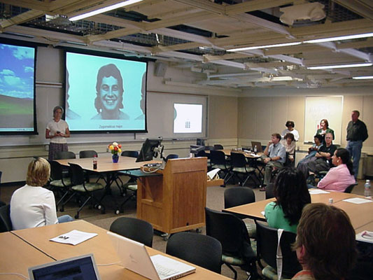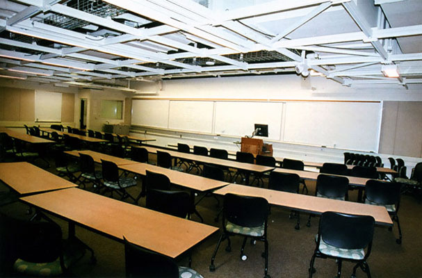 In this state-of-the-art classroom students and Professors can each independently project images from laptop computers at the desks or the podium onto multiple screens at the front of the classroom allowing live interaction between students and teachers on screen while the students remain seated. Teleconferencing enables discussions with classes at other institutions the worldwide.